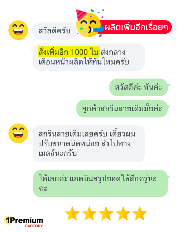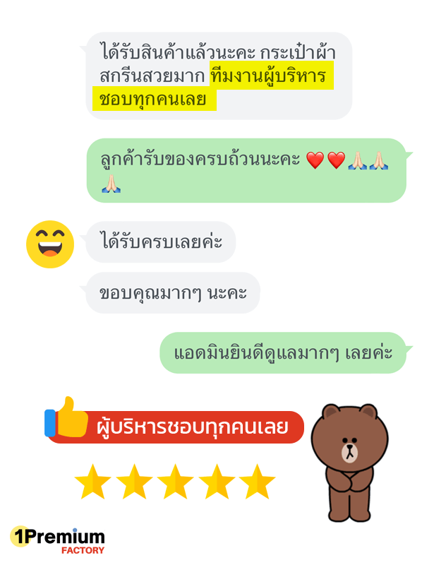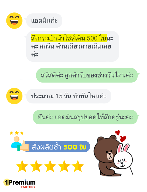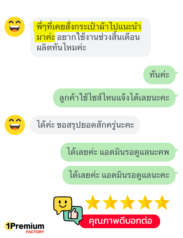 - วันแรกจนถึงวันนี้ เราสะสมประสบการณ์กว่า 10 ปี ที่ 1Premium Factory เพื่อเป็นร้านรับสกรีนกระเป๋าผ้าที่ให้บริการได้ครบวงจร ตั้งแต่เป็นโรงงานตัดเย็บกระเป๋าผ้าสกรีน ถุงผ้าหูรูด พิมพ์ลายสกรีนโลโก้คุณภาพเยี่ยม ตลอดระยะเวลาที่ผ่านมา เราได้พัฒนาตัวเองจนกลายเป็นโรงงานผลิตกระเป๋า เป็นร้านสกรีนกระเป๋าผ้าแบบครบวงจร ที่ไม่ได้เพียงแค่รับสกรีน แต่ยังออกแบบและตัดเย็บเองทั้งหมด ไม่ว่าจะเป็นถุงผ้าดิบธรรมดา ถุงผ้าหูรูด ประเป๋าผ้าหูหิ้ว กระเป๋าทรงกล่อง หรือทรงยู เรามีให้เลือกหลากหลายตามความต้องการของลูกค้า